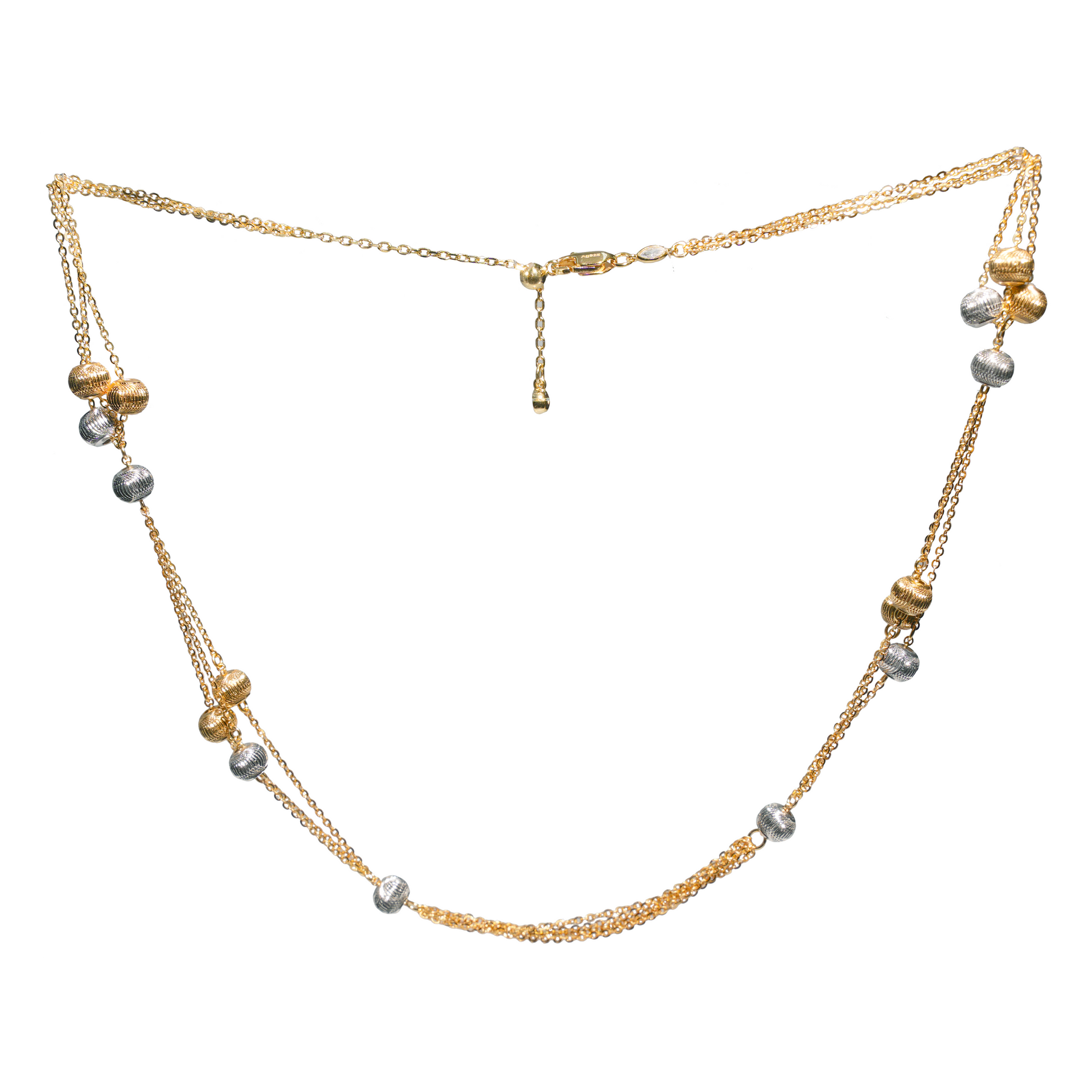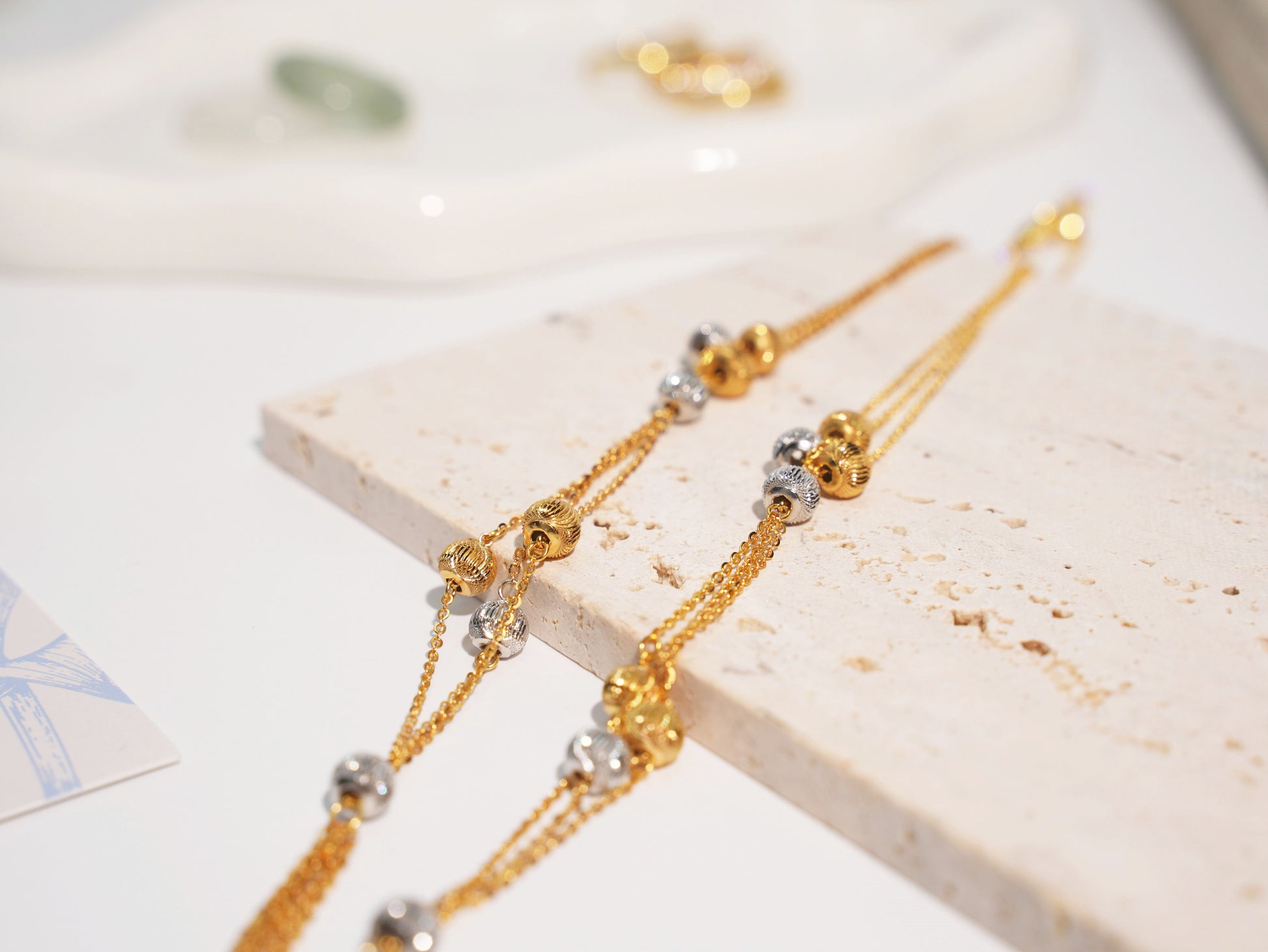 This necklace uses three gold chains, and the two kinds of gold and silver balls echo each other, shining.